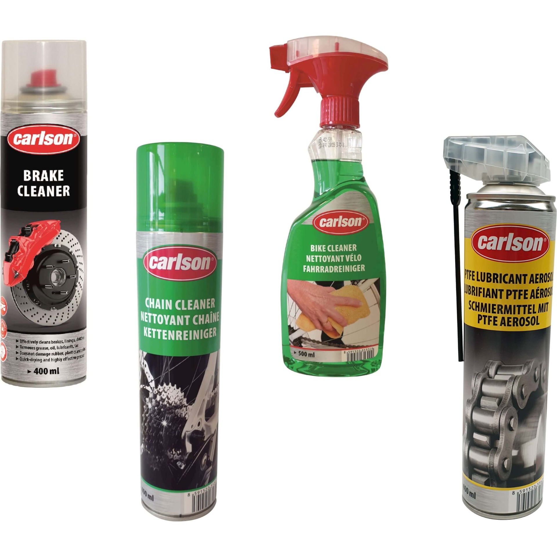 Carlson introductiepakket met hierin: 1x Carlson kettingreiniger 400ml. Zeer effectief voor het reinigen en ontvetten van fietskettingen. Verwijdert olie, vet, vaseline en vuil. 1x Carlson remreiniger 400ml. Verwijdert effectief vet, remvloeistof, olie, smeermiddelen, teer enz. van remblokken en schijven. 1x Carlson fietsreiniger 500ml met trigger. Voor het reinigen en onderhouden van zwaar vervuilde fietsonderdelen - frames, derailleurs, cassettes, pedalen, kettingen, enz. 1x Carlson smeerolie PTFE 400ml. Verwijdert vocht. Vermindert wrijving en slijtage. Verlengt de levensduur van de ketting.